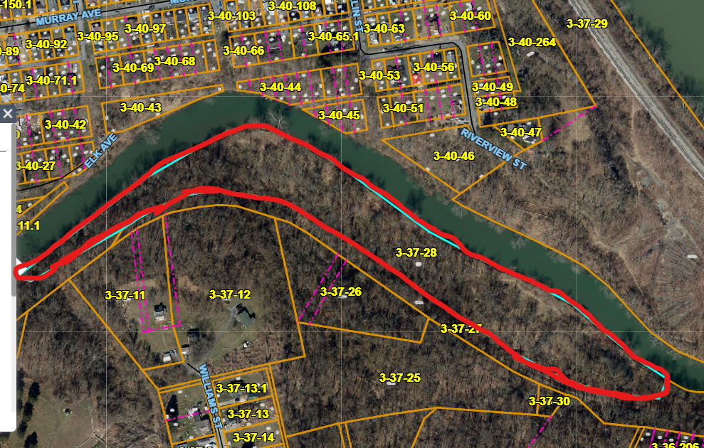 The east end of this property is located less than a quarter mile from where Buffalo Creek meets the Monongahela river. To access the property, a person has to go past the sewage treatment plant and down the railroad tracks. It's surely in a flood zone, so no one could build. There are some lagoons and other infrastructure from the sewage plant and railroad down there. I'm not sure about legal access and who else might have rights of way on the property. I have not had a survey done. The Assessor's parcel description calls it 4.23 acres but using the map measurement tool on their mapping website it comes out to 9 acres.